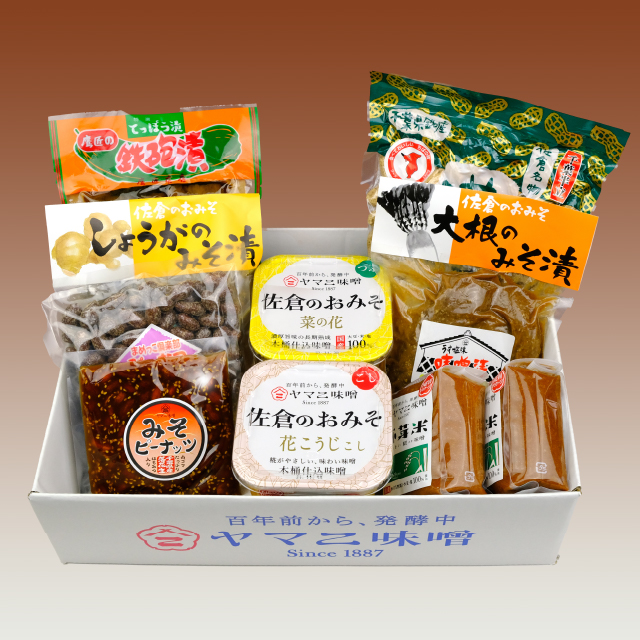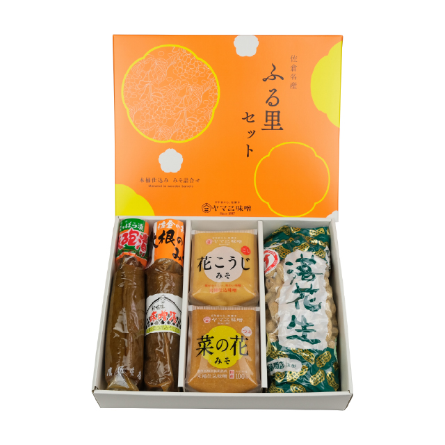 ふる里セット(E102) 価格:6,048円(税込) 数量 1 2 3 4 5 6 7 8 9 10 ◆花こうじみそカップ(700g)×1 ◆菜の花みそカップ(700g)×1 ◆胚芽米糀入りみそ(500g)×2 ◆大根のみそ漬(350g)×1 ◆生姜のみそ漬(250g)×1 ◆殻付き落花生(200g)×1 ◆まめっこ倶楽部(250g)×1 ◆みそピーナッツ(170g袋)×1 ◆鉄砲漬(230g)×1