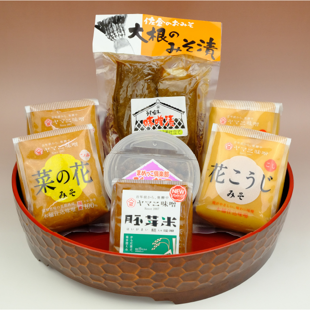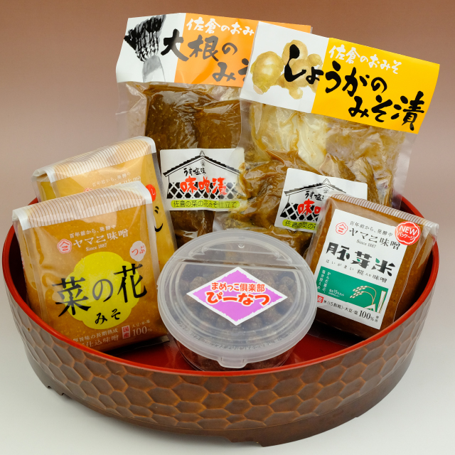 ふる里セット(C103) 価格:4,050円(税込) 数量 1 2 3 4 5 6 7 8 9 10 ◆菜の花みそ(750g)×1 ◆花こうじこしみそ(750g)×1 ◆みそピーナッツ(170g)×1 ◆大根のみそ漬(350g)×1 ◆胚芽米糀入りみそ(500g)×1 ◆まめっこ倶楽部(250g)×1