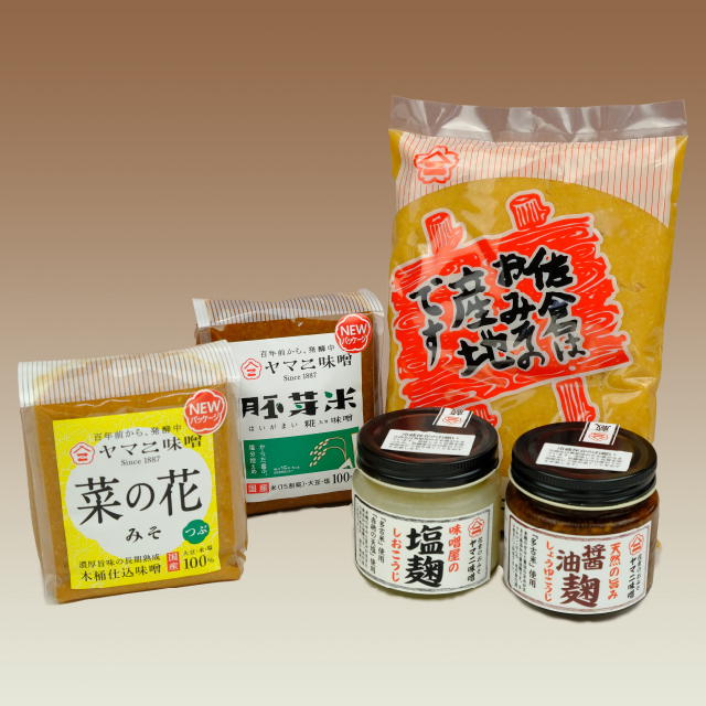 麹いっぱいセットA(KI101) 価格:2,268円(税込) 数量 1 2 3 4 5 6 7 8 9 10 クール便 ¥220 ◆花こうじみそ(850g)×1 ◆菜の花みそ(500g)×1 ◆胚芽米糀入りみそ(500g)×1 ◆塩麹(140g)×1 ◆醤油麹(140g)×1 段ボール箱入りとなります。※クール便対応