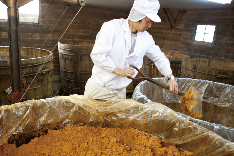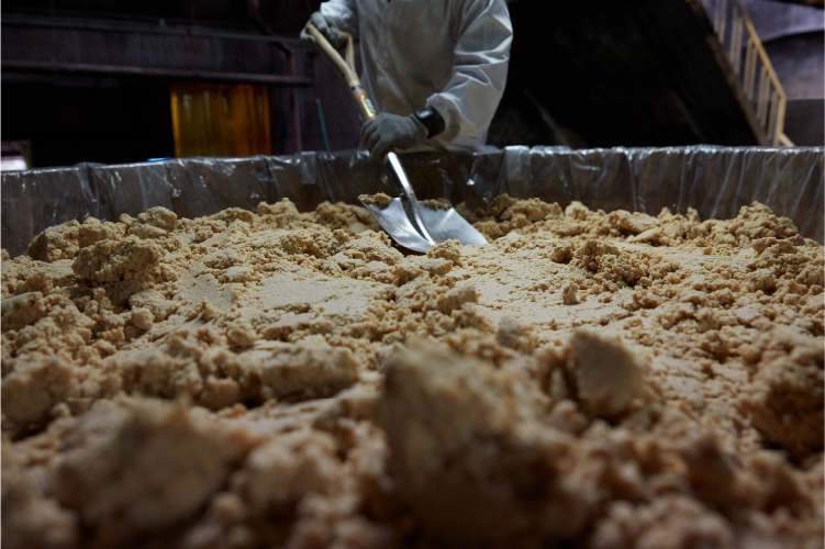 新たに味噌を仕込む際、先に仕込んである「生きている味噌」を掘り出し、「発酵熟成の種」として加えて仕込みます。創業当時から受け継ぐ味は、今仕込んでいるお味噌にも、しっかり受け継がれています。
