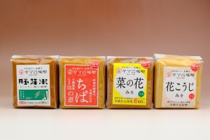 「昔づくり(菜の花みそ)」「思出づくり(花こうじこしみそ)」「胚芽米入りみそ」「ちばの恵」の4種類のお味噌が入っているので、ヤマニ味噌のほぼ全ての味をお試し頂けます。